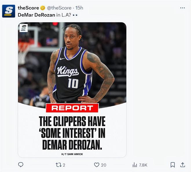 赛前TA记者萨姆-阿米克就报道,洛杉矶快船有意德罗赞,因为国王已经将德罗赞、拉文、小萨、蒙克等人摆上货架,甚至有传言说国王可能会裁掉德罗赞。