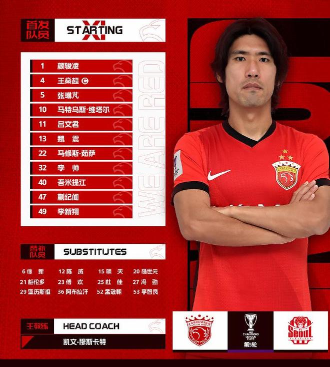 本场比赛,上海海港在首发上派出了1-颜骏凌、4-王燊超、5-张琳芃、13-魏震、32-李帅、40-吾米提江、10-维塔尔、22-尤萨、11-吕文君、47-蒯纪闻、49-李新翔的阵容。