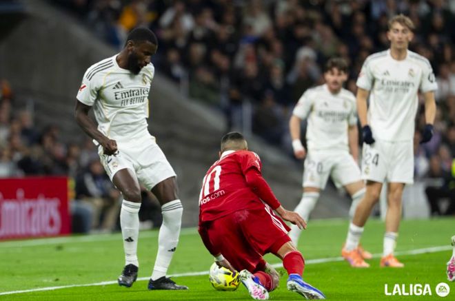 3分钟后,轮到贝林厄姆倒在禁区了,裁判第一时间吹罚点球,回看过后又取消了点球。